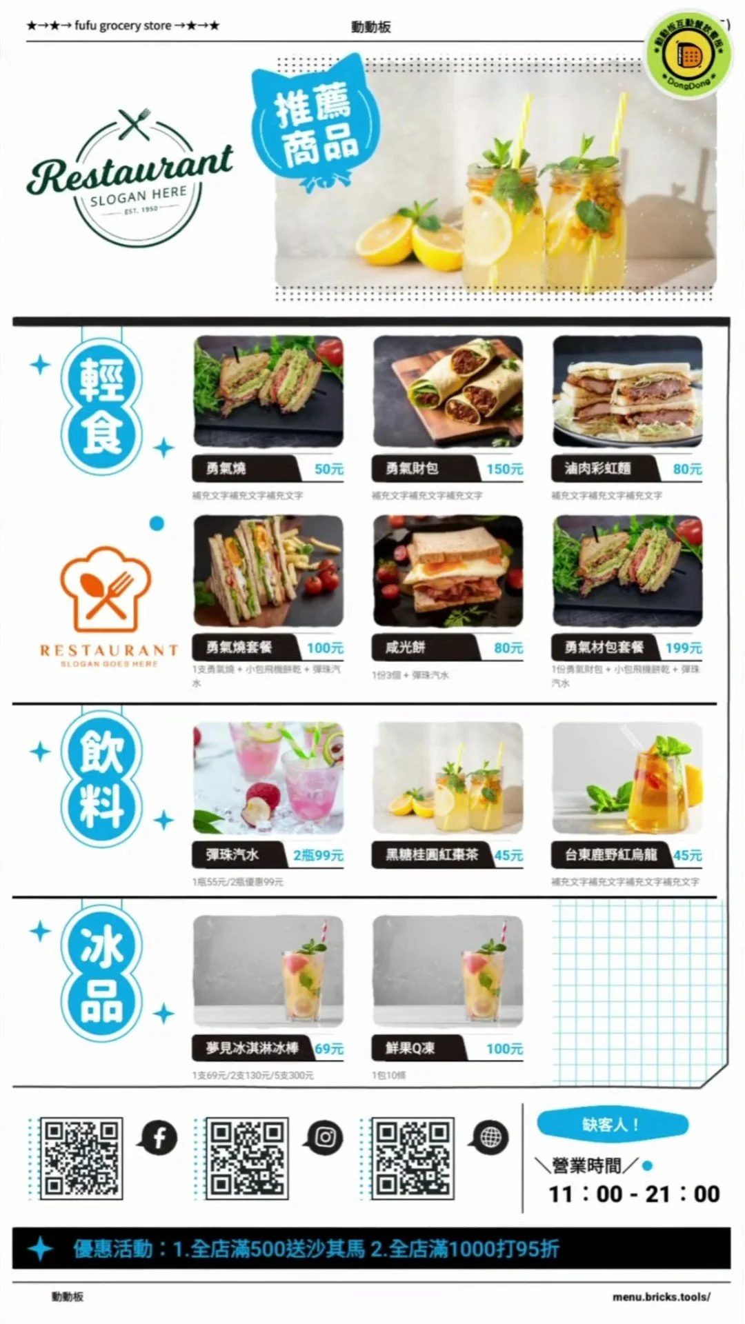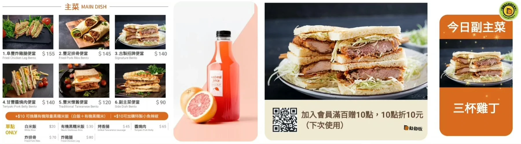 功能:售完貼紙、照片輪播、推薦餐點輪播、主打餐點、店長大聲公、五星好評、QR Code導購、跑馬燈、品牌Logo海報