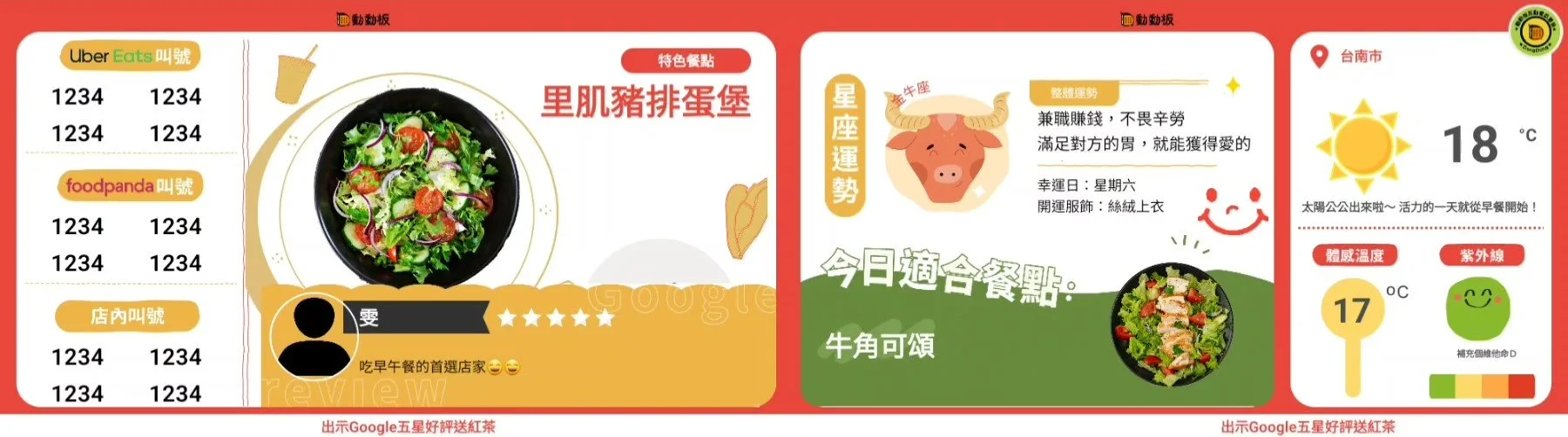 功能:動態宣傳海報、餐點排行榜、售完貼紙、熱賣貼紙、推薦餐點輪播、條列式菜單、店內大聲公、推薦餐點、店內取餐叫號、外送叫號、照片影片輪播*1、Google五星好評、跑馬燈